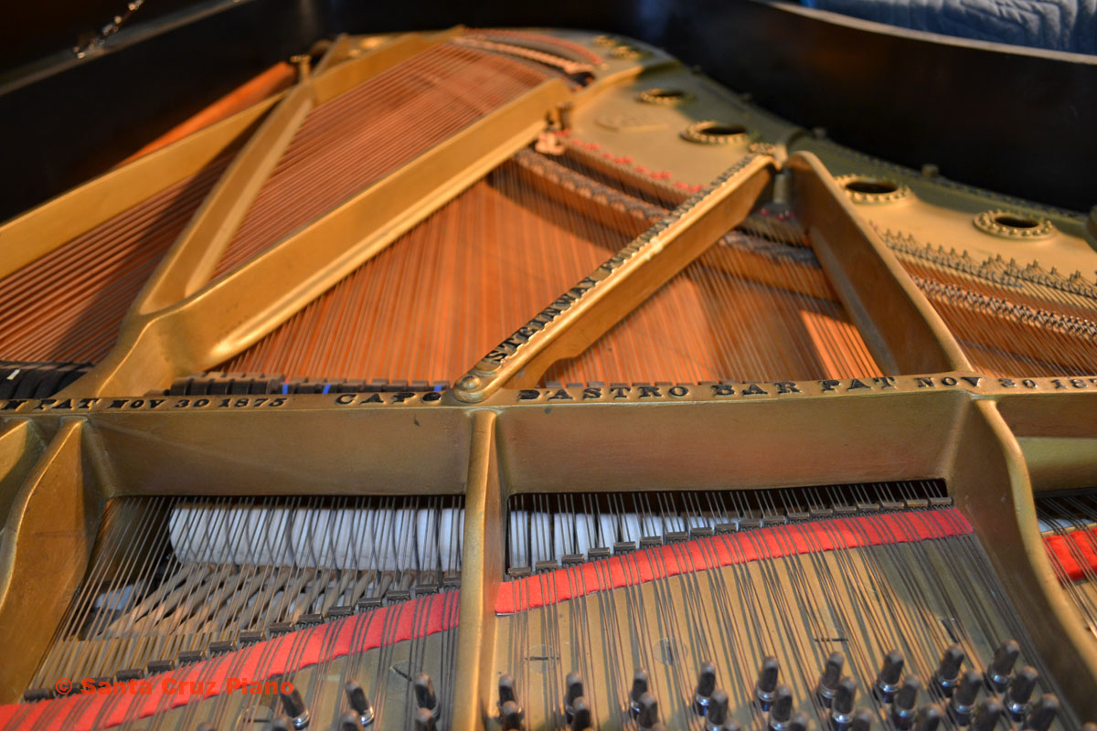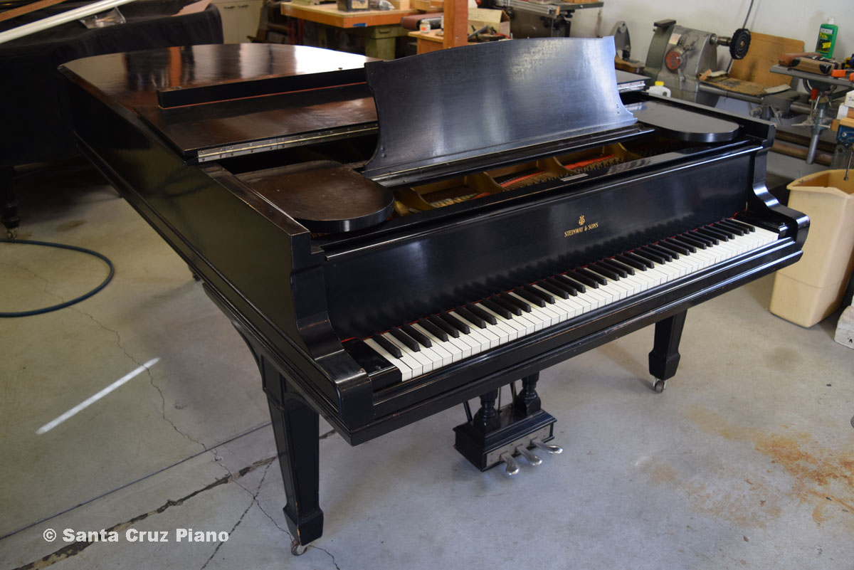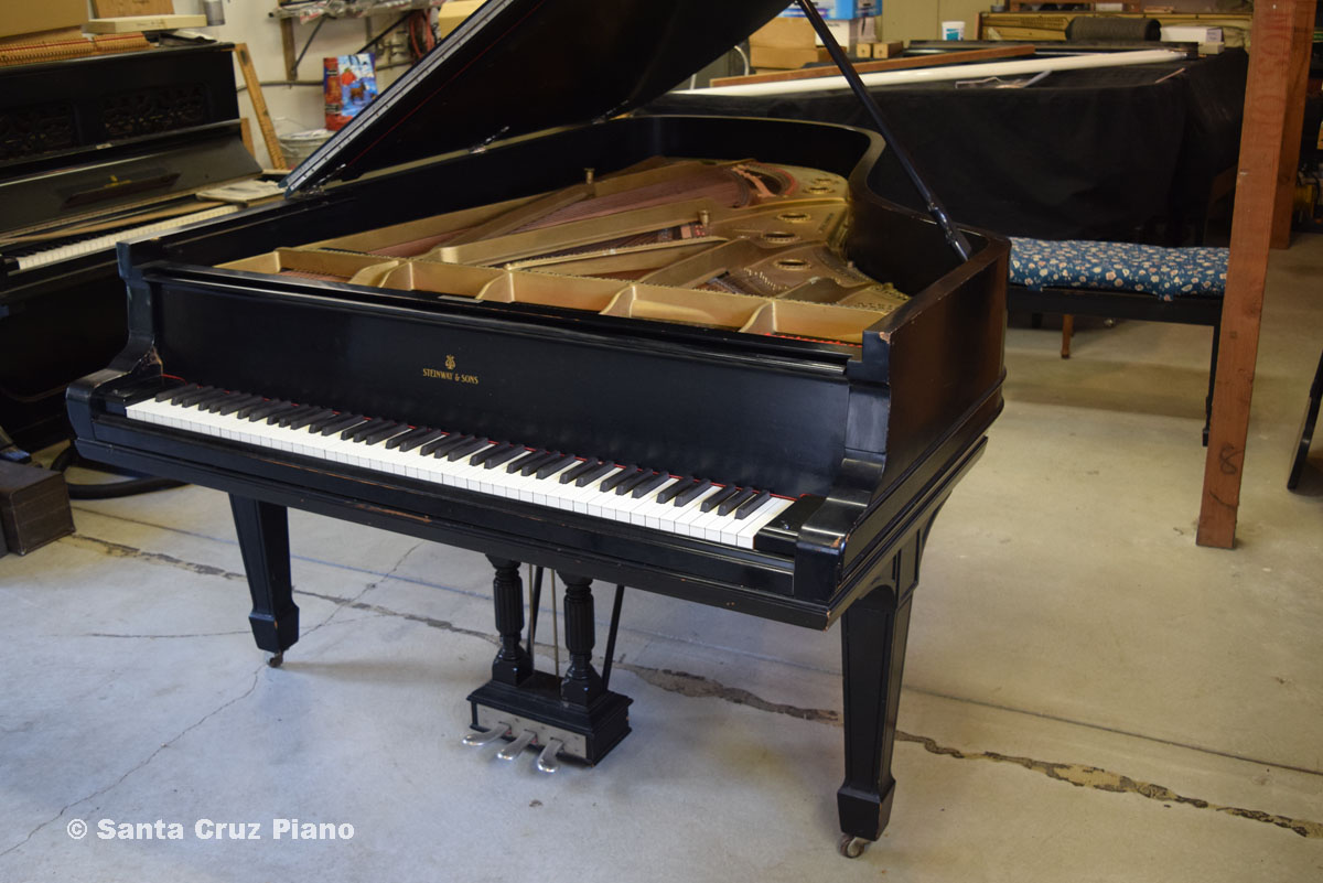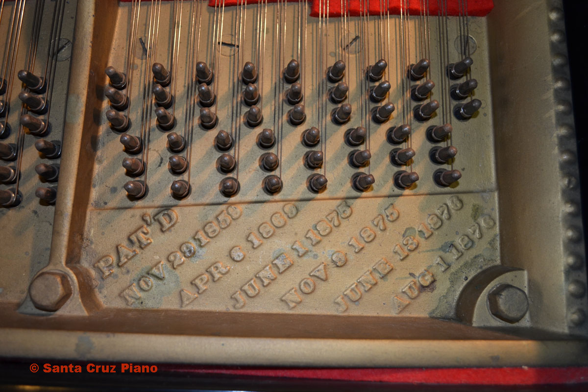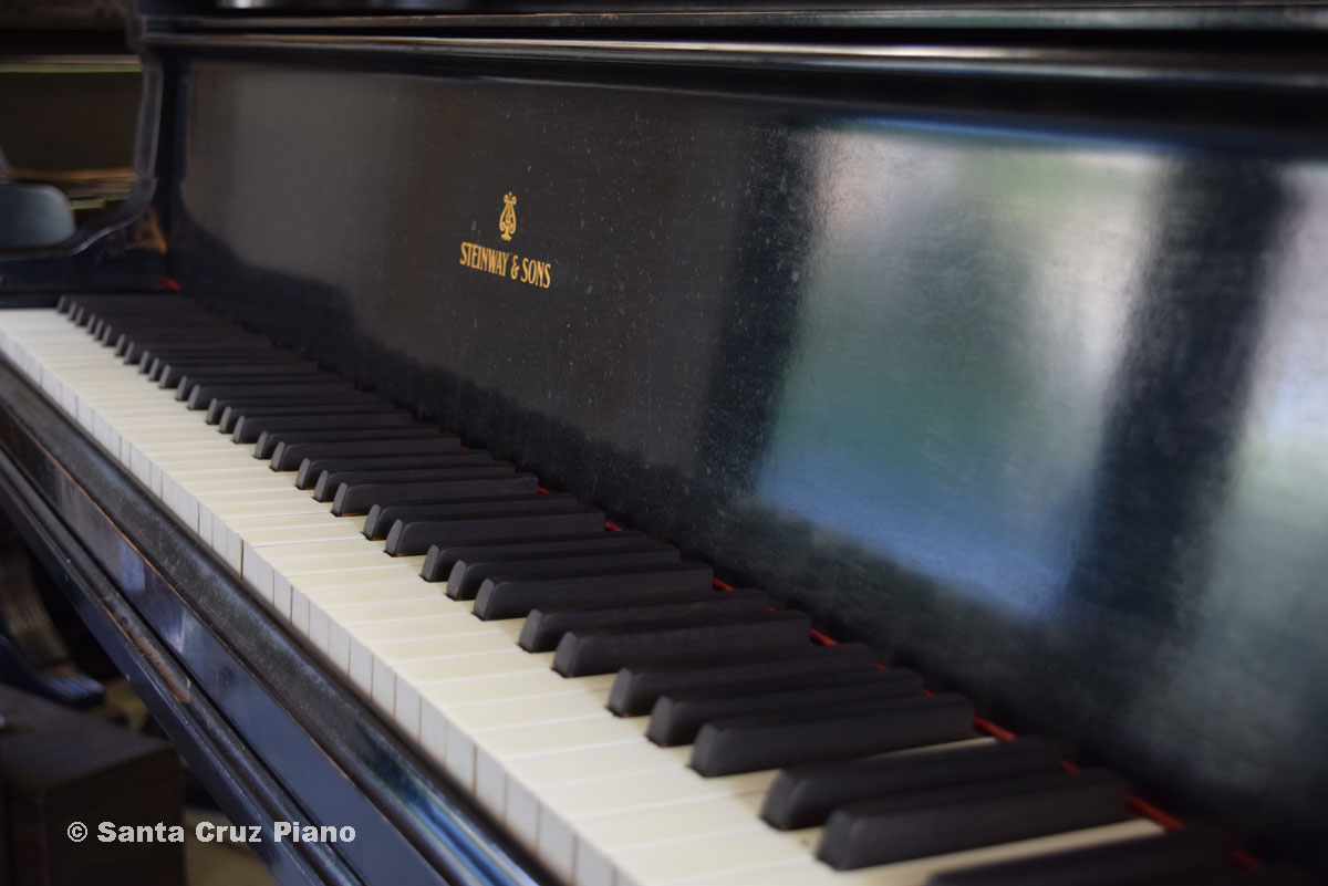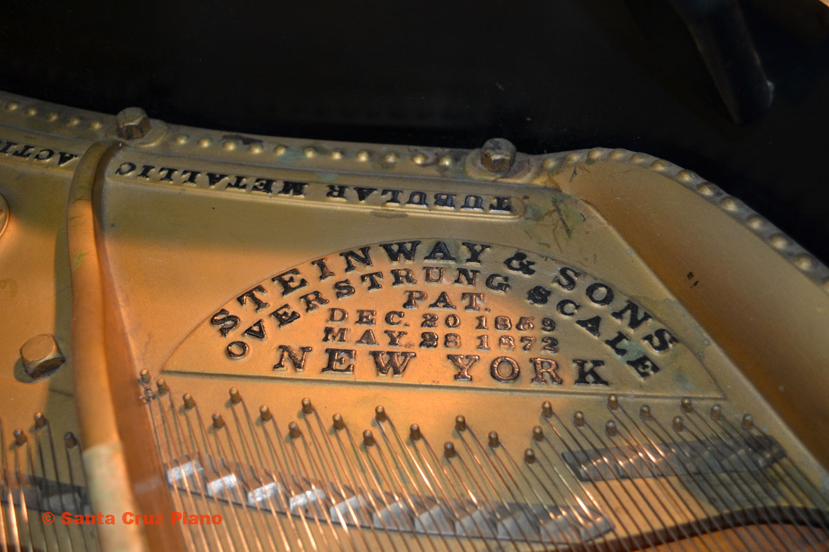 Full History at this link This Model C is Serial #73505, manufactured in 1892 and has 88 notes. It lived in the Santa Cruz Mountains for many years. The action was unplayable when I purchased it, so I never heard this instrument’s potential before purchase. Before making big decisions about how far to restore this piano, I wanted to hear the tone of the original soundboard. So I installed gently used 20-year-old authentic Steinway action parts to be able to play it, and updated the damper underlevers with metal receptacles to hold the dampers securely. The piano plays well-enough now to hear what it can do. I would judge the soundboard to have 75-80% of its original sustain remaining. It was re-strung and refinished quite some time ago (estimate 50 years) but is fully functional as is, and of course worthy of extensive restoration if desired.