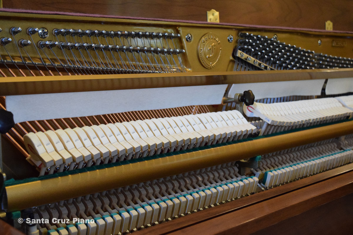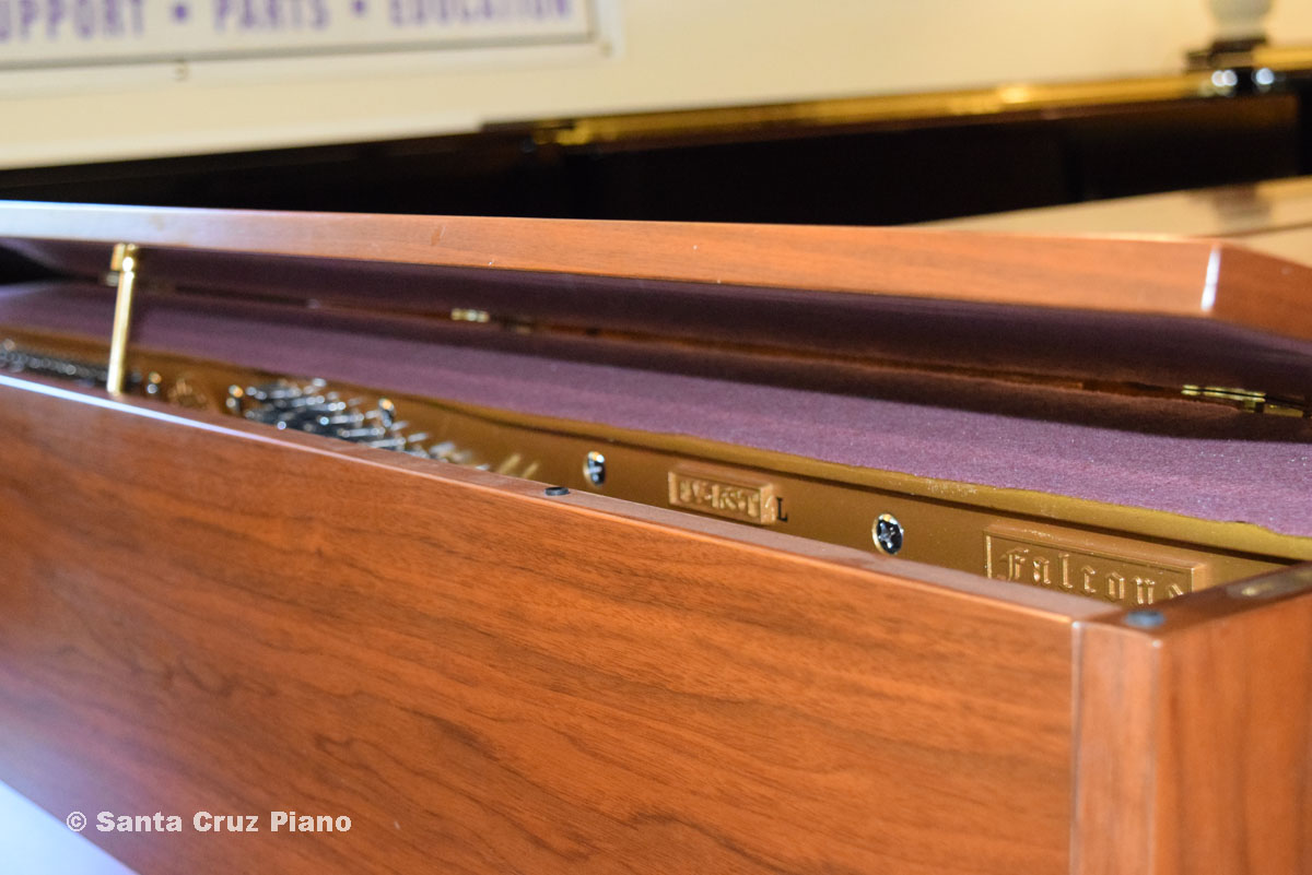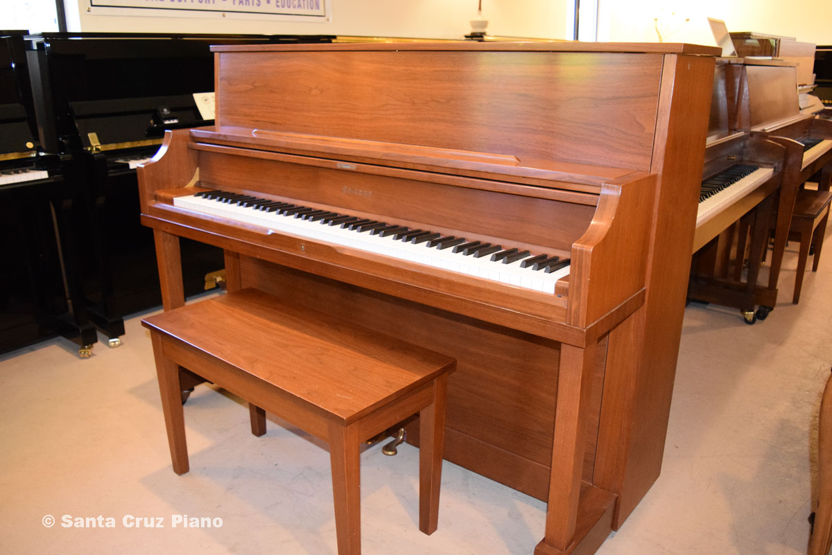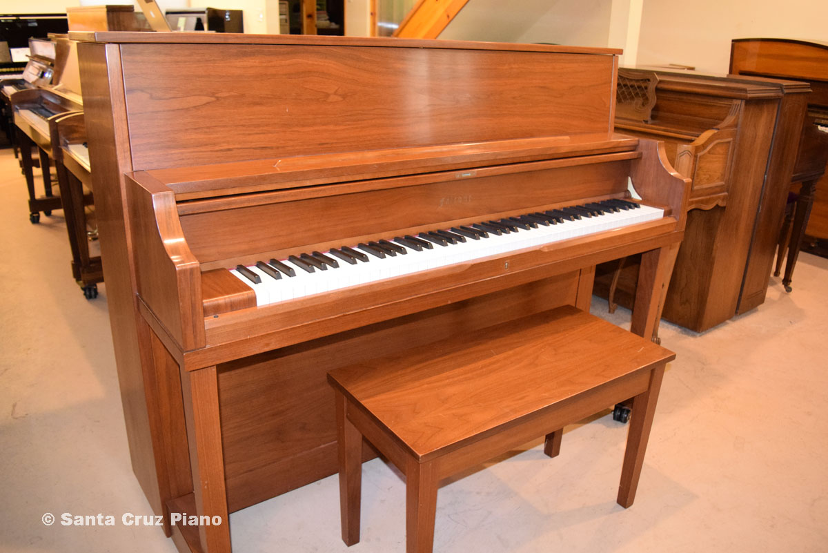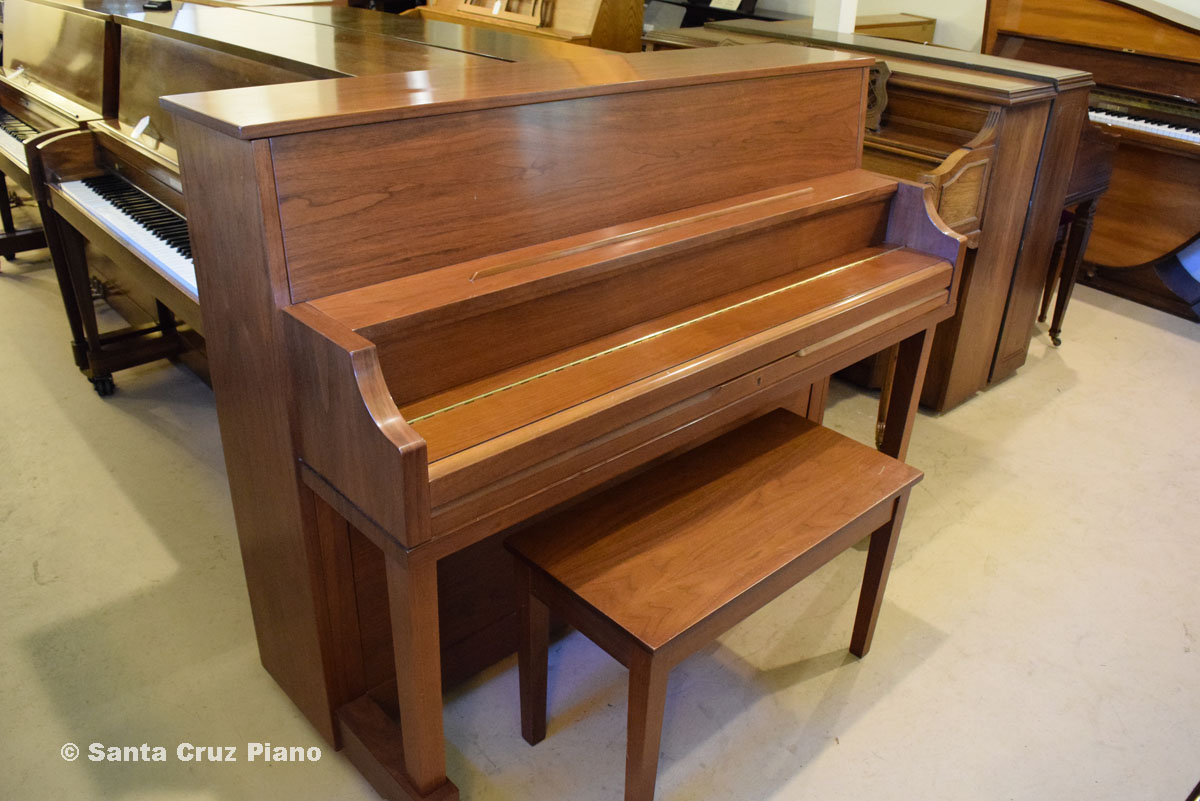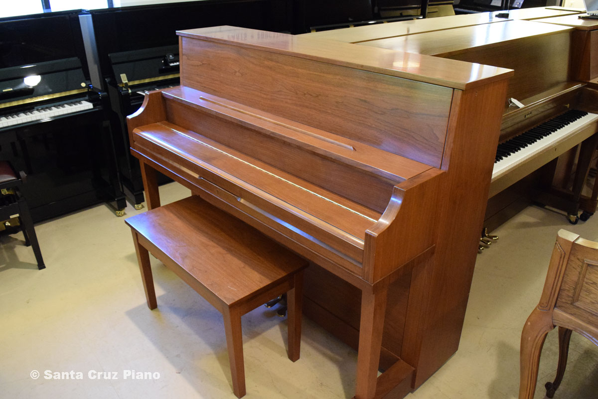 This beautiful walnut finish decorates a great sounding piano. It’s got a felt mute-rail for quieter practice, and large double-rubber wheels which make it very easy to move. Comes with the matching bench (pictured). Lid-prop allows sound to fill the room.