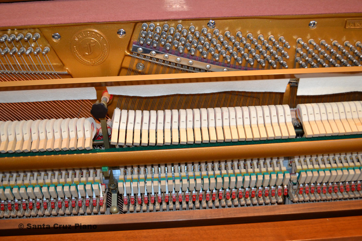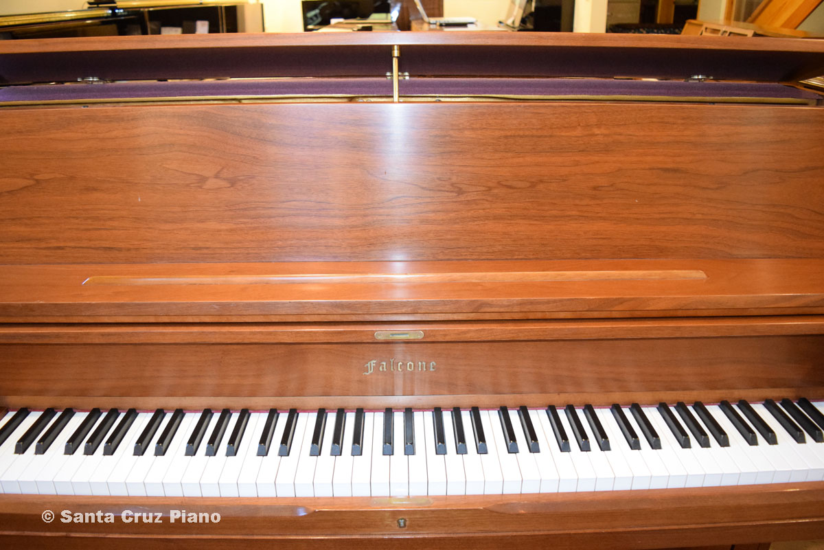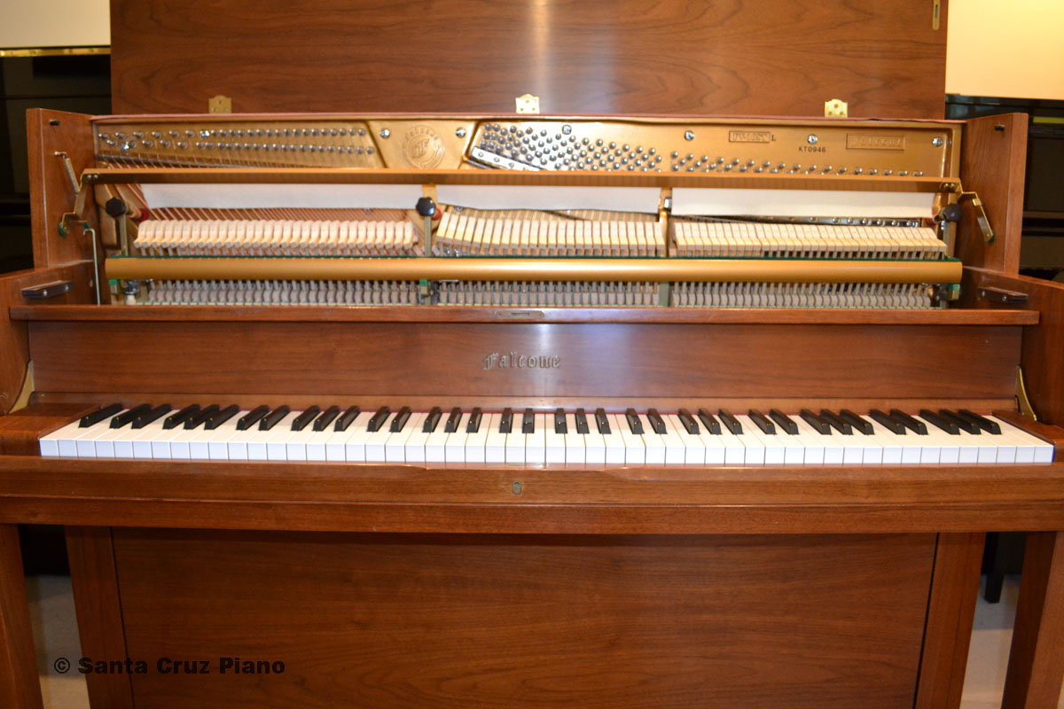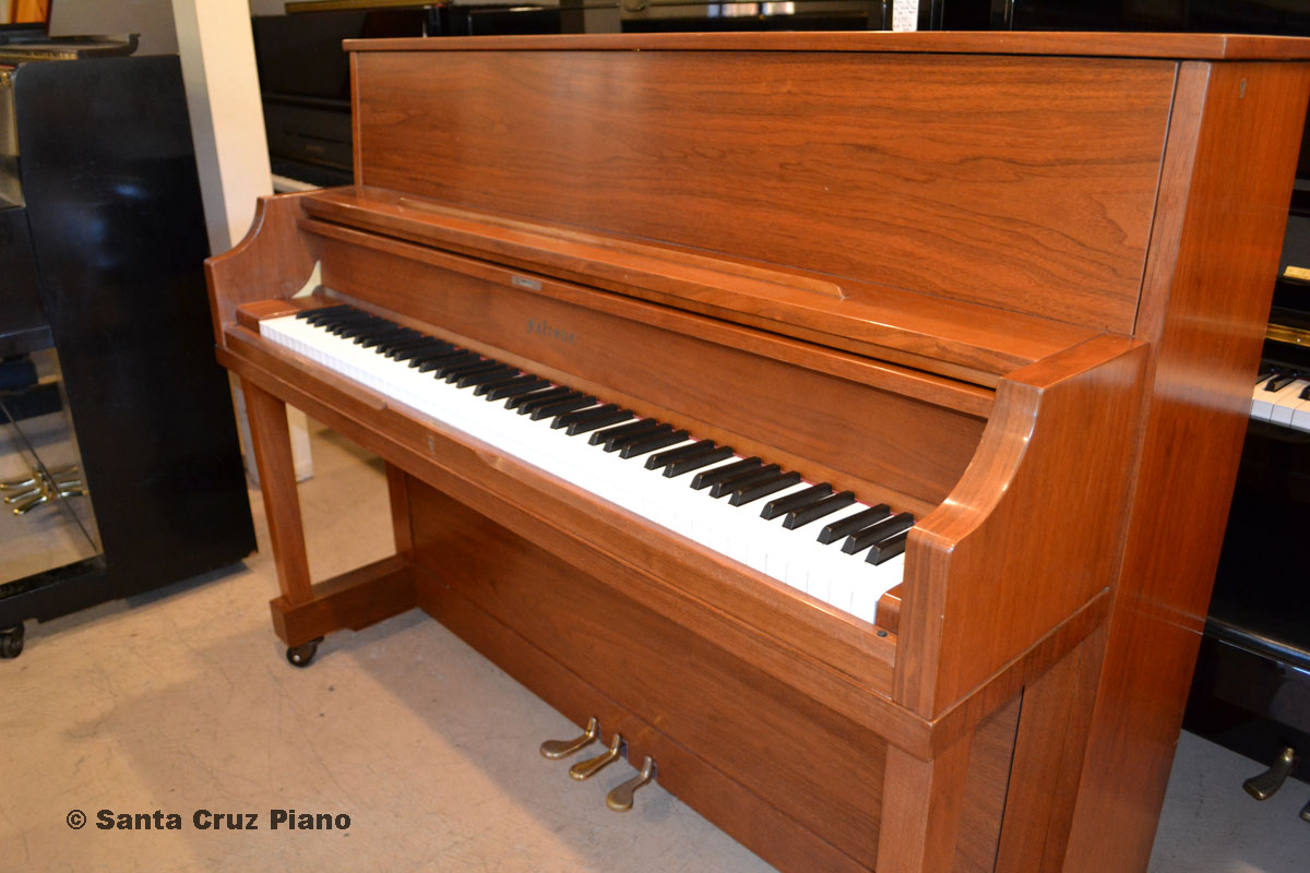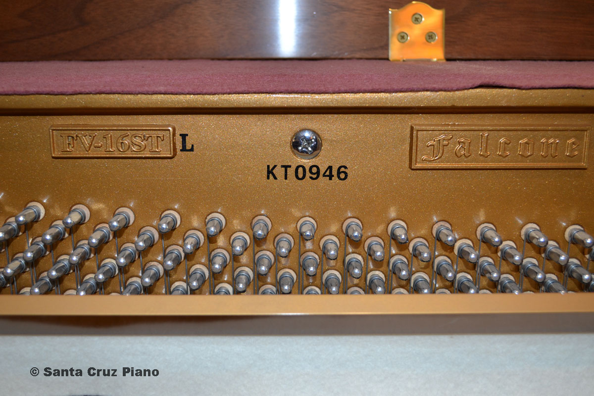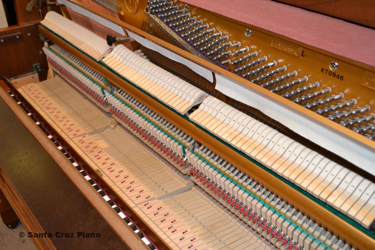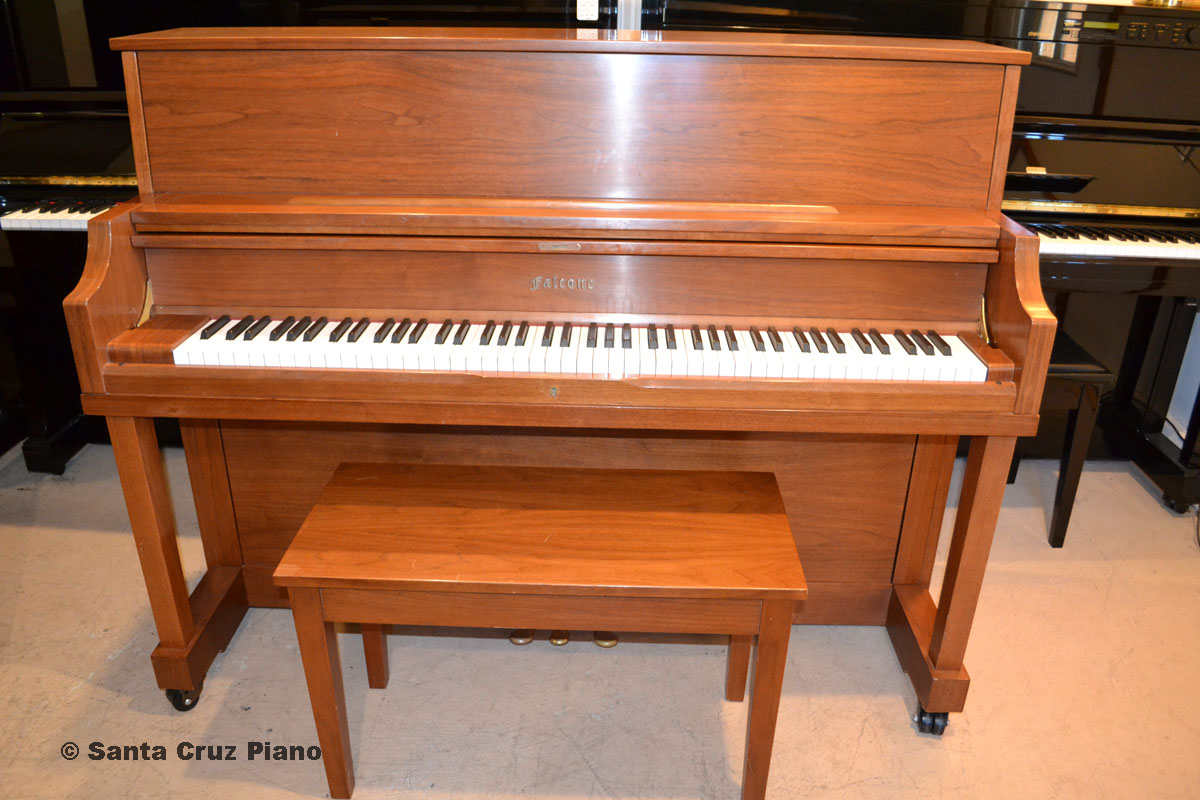 This beautiful walnut finish decorates a great sounding piano. It’s got a felt mute-rail for quieter practice, and large double-rubber wheels which make it very easy to move. Comes with the matching bench (pictured). Lid-prop allows sound to fill the room.