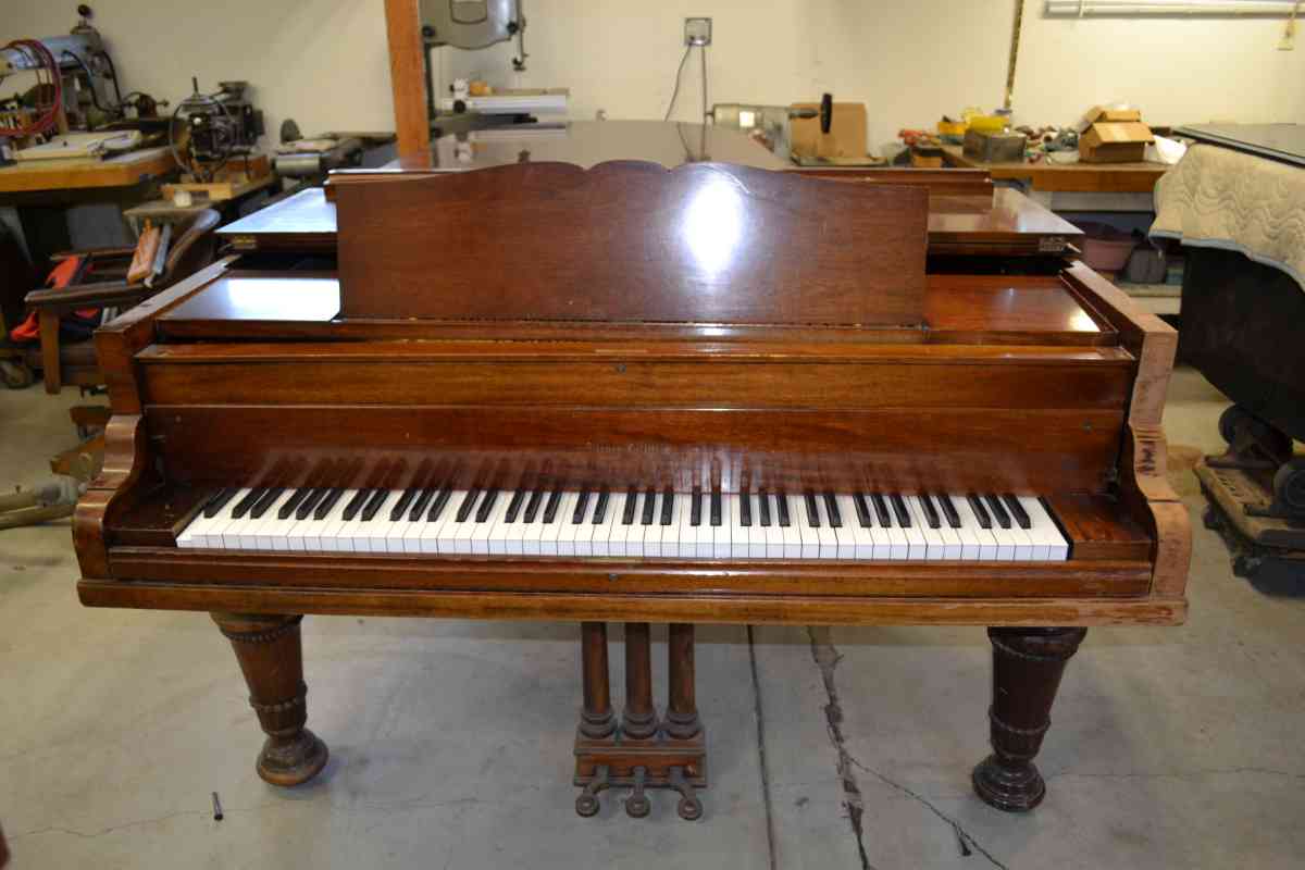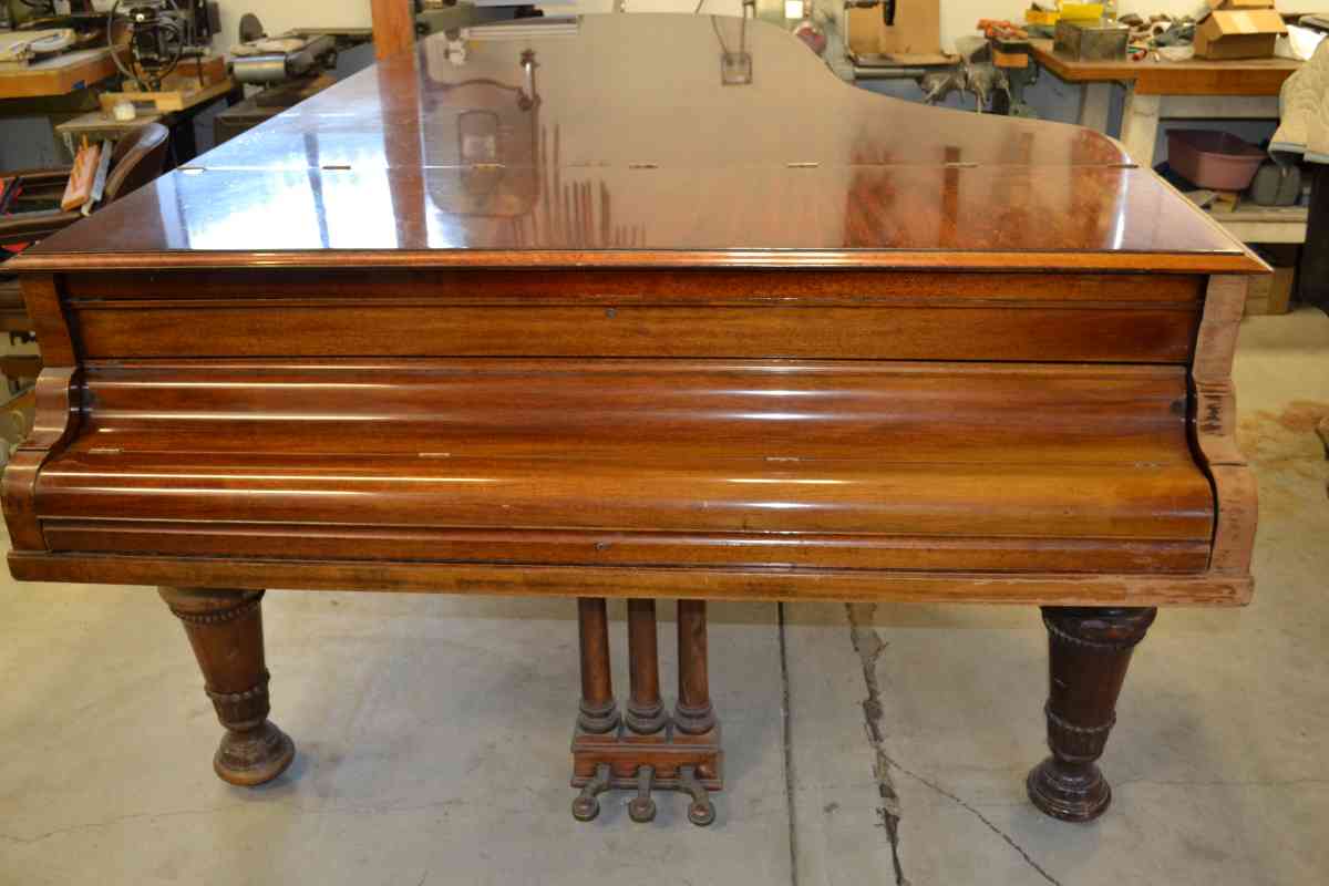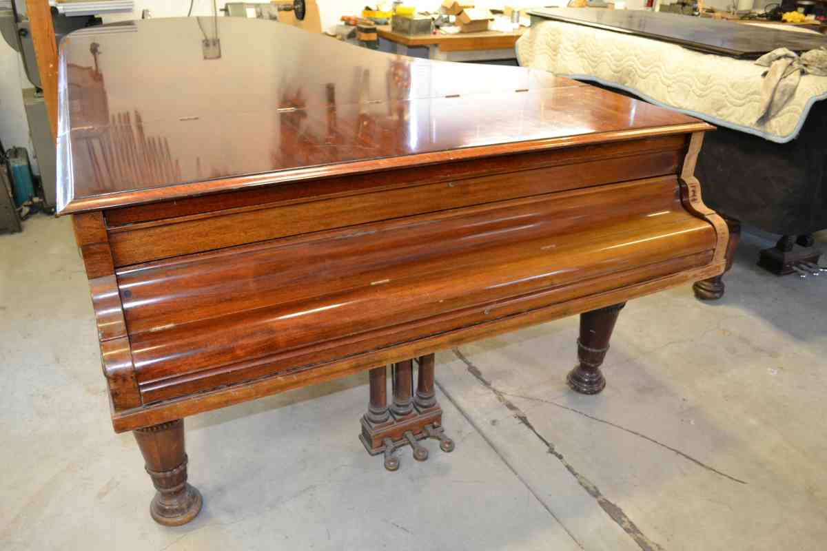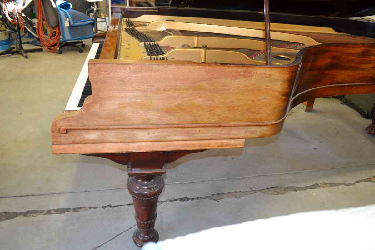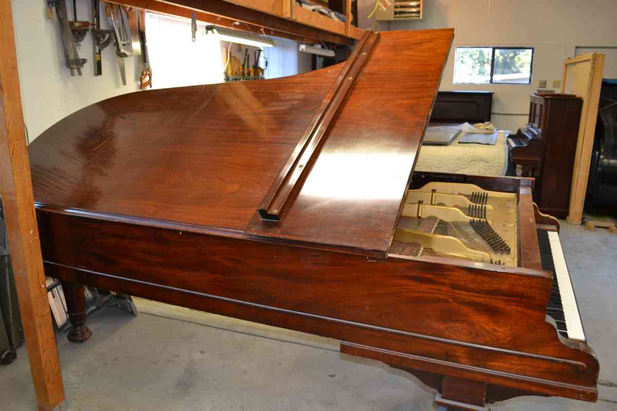 9 foot concert grand 1912. Mahogany. Needs a pinblock. Finish repair on right front. Soundboard good. Agraffes to note 88.